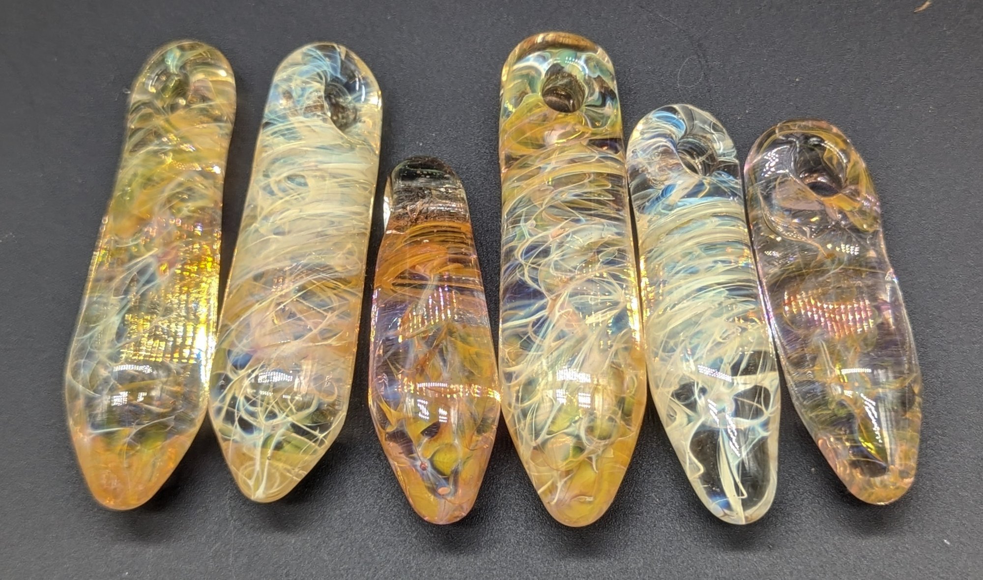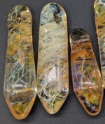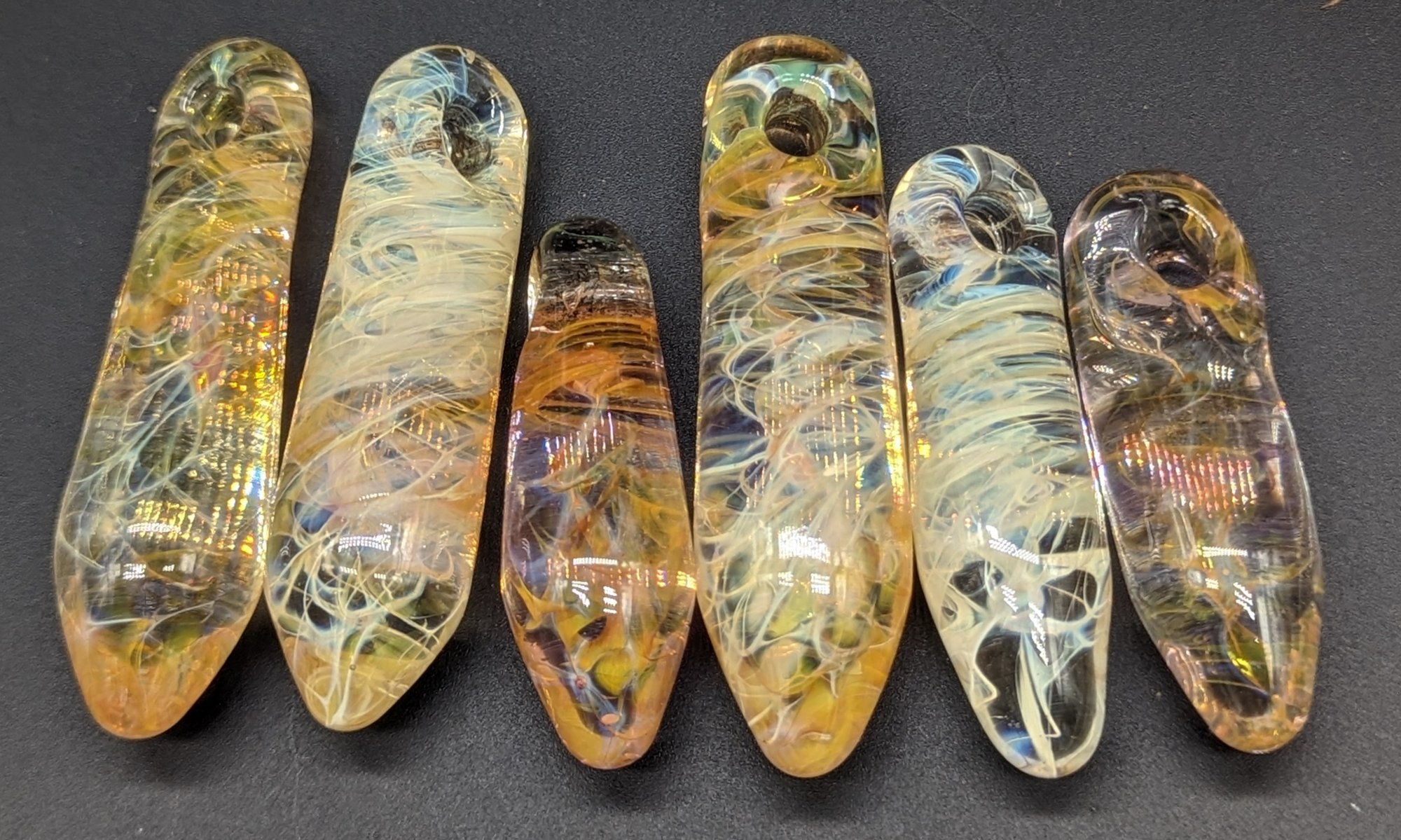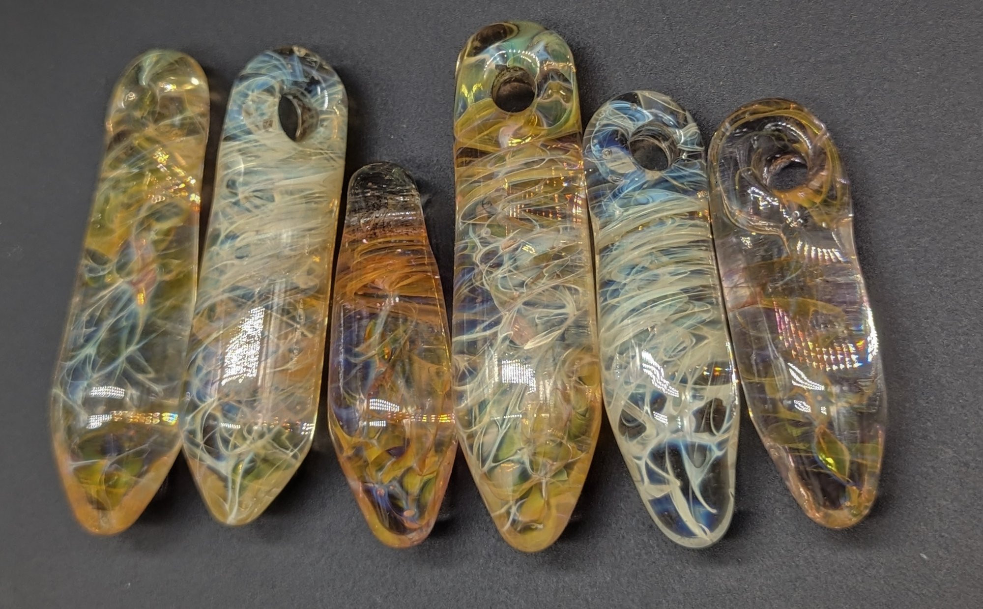 These are fume pendants between 30-50mm in length. They can be made with a specific color mix you like based on the 5 in the photos.